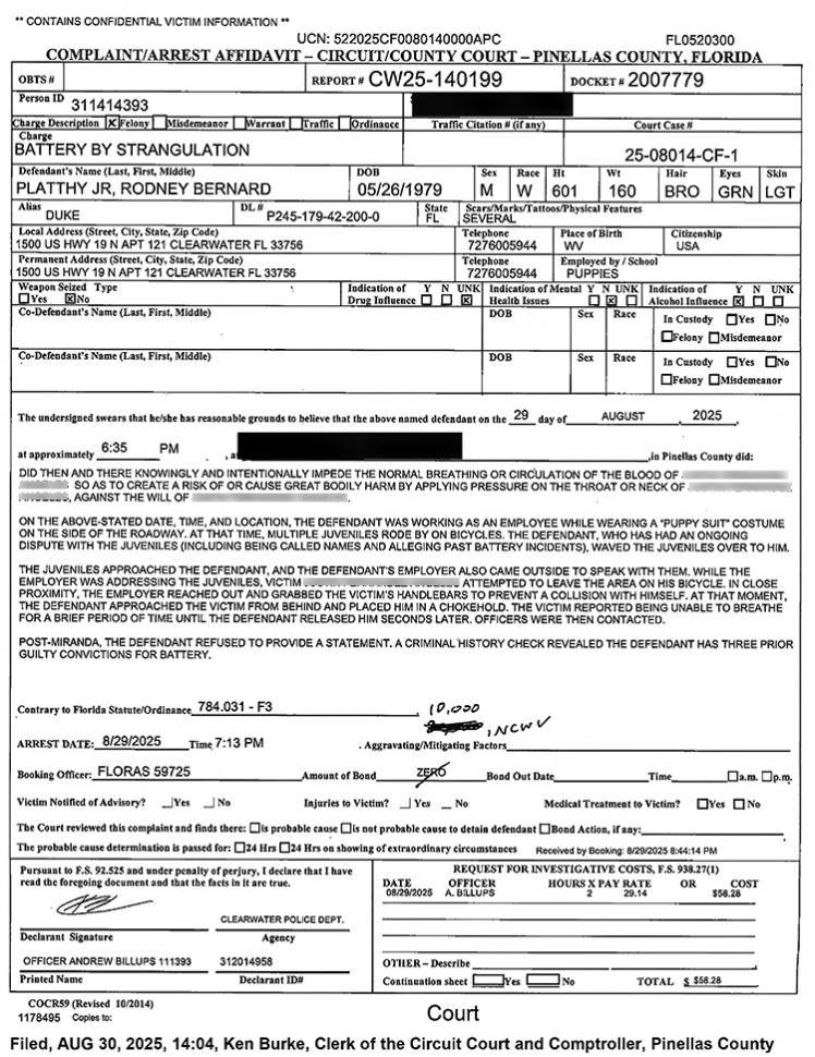 Platthy was arrested for battery by strangulation, a felony. The defendant, according to an arrest affidavit, showed an “indication of alcohol influence” and refused to speak with cops.