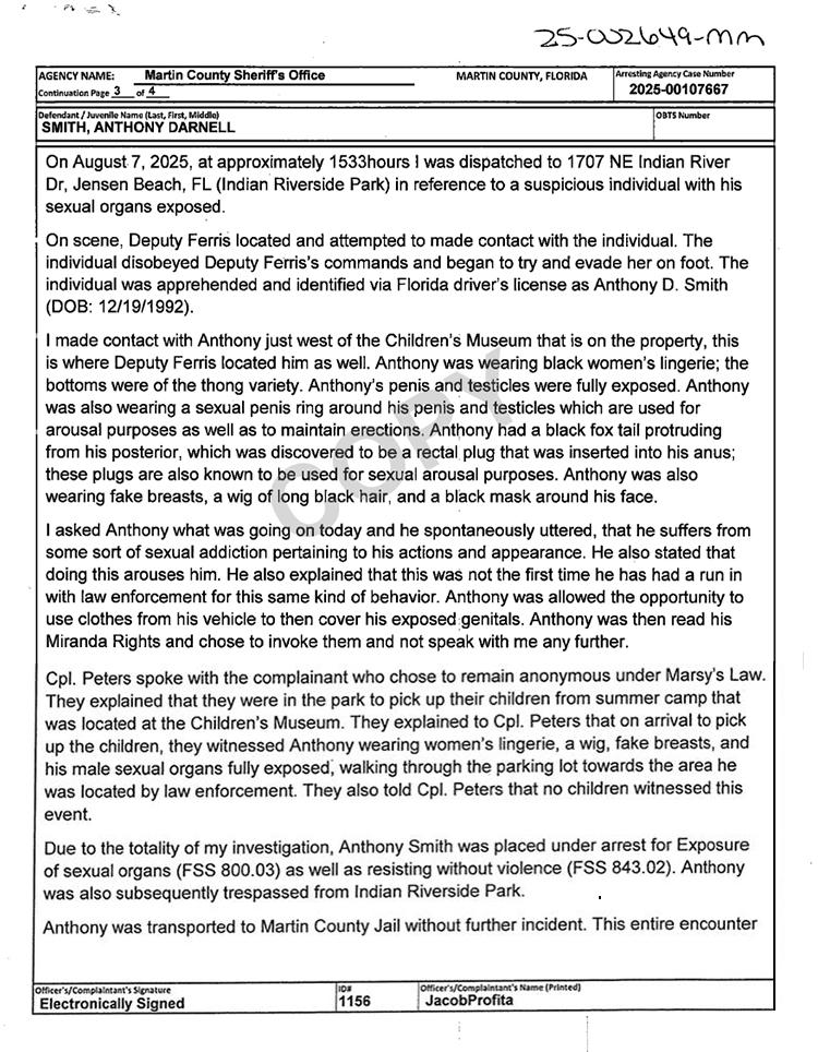 Smith, who works as a party/wedding DJ, allegedly tried to evade a cop who initially discovered him inside Indian Riverside Park in Jensen Beach. He was eventually apprehended near the Children’s Museum of the Treasure Coast.