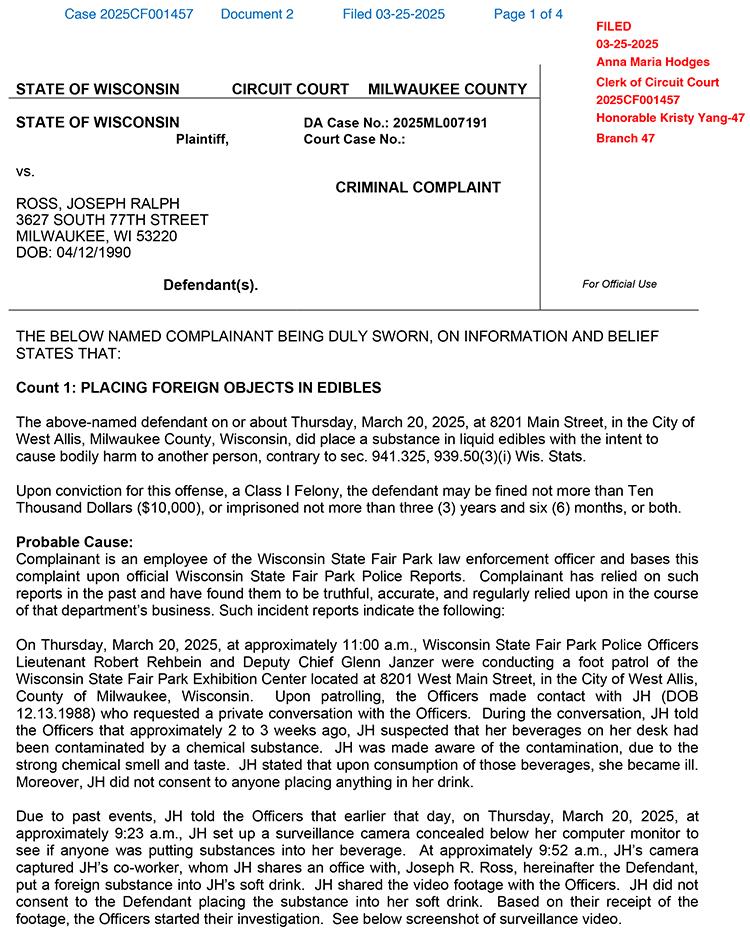 During a Circuit Court hearing, Joseph Ralph Ross, 35, copped to a felony charge of placing foreign objects in edibles. The Milwaukee resident, whose admission came after plea negotiations with prosecutors, is scheduled to be sentenced on October 9.