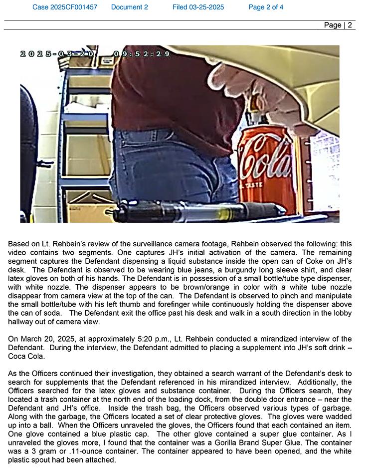 As detailed in a criminal complaint, the woman told police that she “suspected the beverages on her desk had been contaminated by a chemical substance” earlier this year. The victim reported becoming ill after consuming the adulterated liquid, which she described as having a “strong chemical smell and taste.”