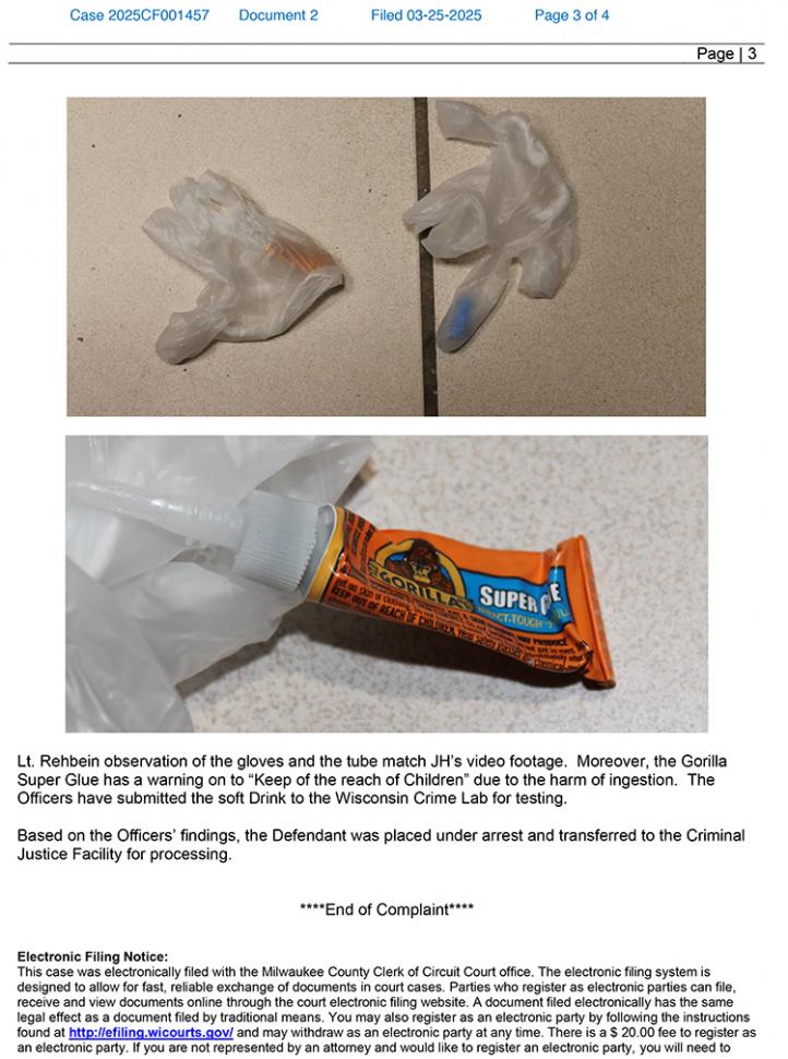 “Due to past events,” investigators noted, on March 20 the woman hid a camera “below her computer monitor to see if anyone was putting substances into her beverage.” Within 30 minutes, the camera recorded Ross, wearing latex gloves, squeezing Gorilla Glue into the victim’s can of Coca-Cola (as seen above).