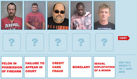 OCTOBER 3--For today’s “Friday Photo Fun” game, readers must examine five mug shots and match each defendant with the alleged crime for which they were arrested.