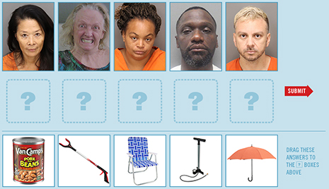SEPTEMBER 19--For today’s “Friday Photo Fun” game, readers must examine five mug shots and match up the defendants with the respective weapons they allegedly wielded during assaults or batteries (can of pork and beans, trash grabber, lawn chair, bicycle pump, umbrella).