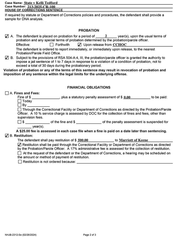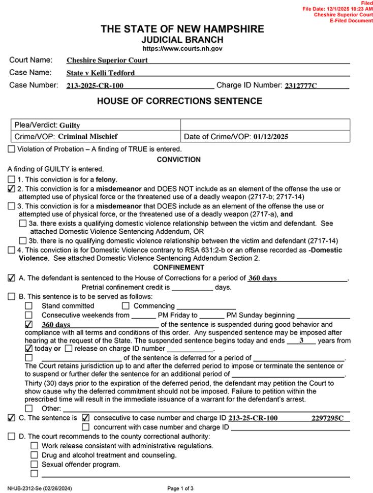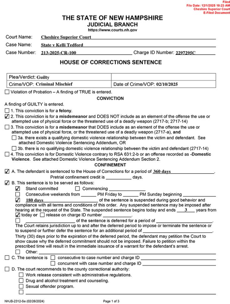 Tedford was sentenced to 360 days in jail, but a judge suspended half of that custodial term. She will be required to serve 180 days in the Cheshire County lockup, after which she will be placed on probation for two years.