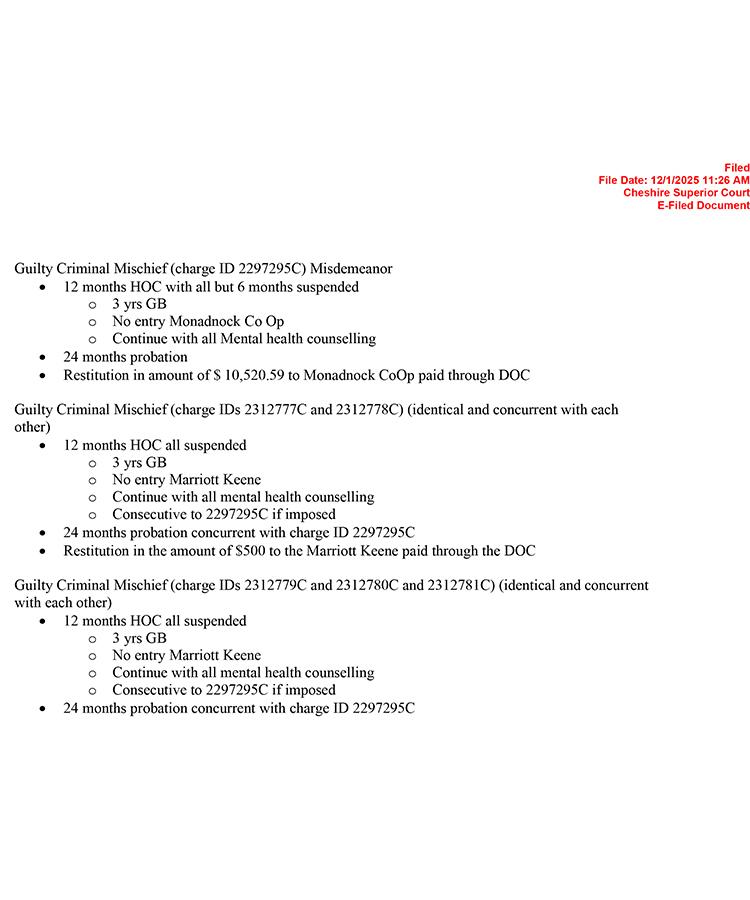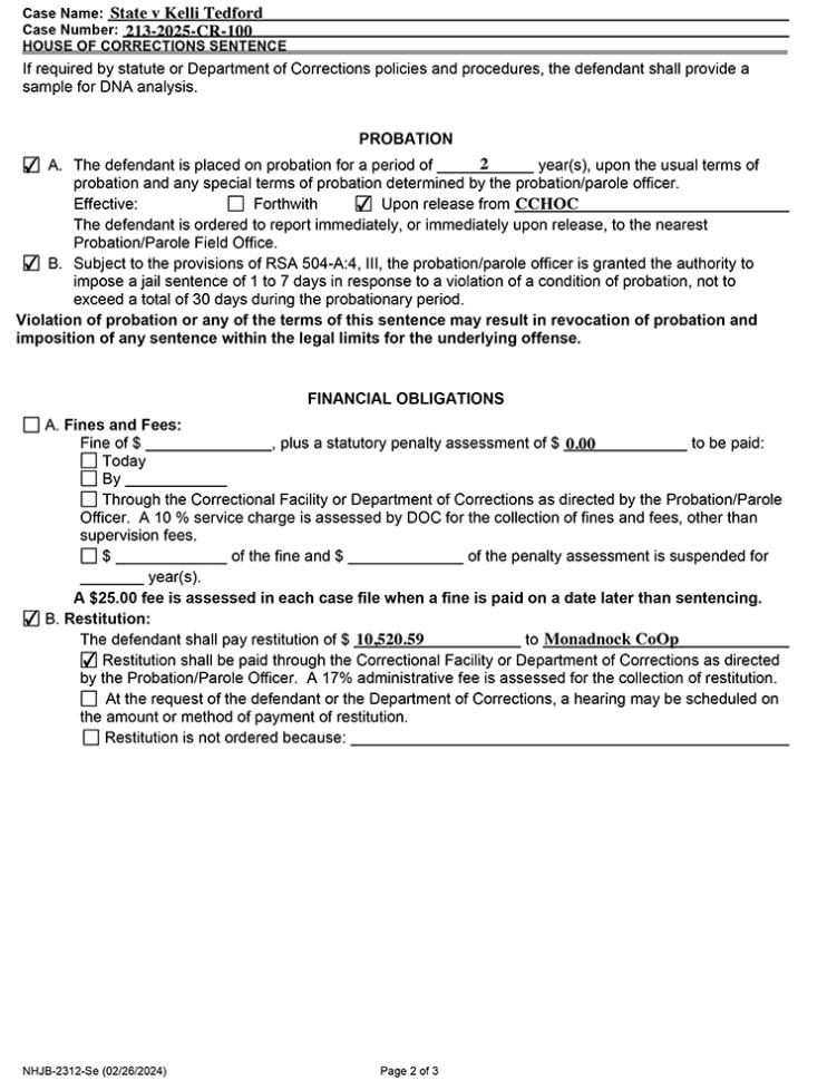 Additionally, Tedford was ordered to pay $10,520.59 in restitution to the Monadnock Food Co-Op for contaminating grocery items (and forcing the business to discard inventory and sanitize its shelves).